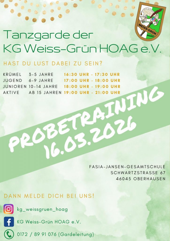 Unsere Aktiven-Garde trainiert zusätzlich noch Mittwochs im Bertha-von-Suttner Gymnasium von 20.00 Uhr bis 21.30 Uhr, sofern die Corona-Regelungen dies zulassen.